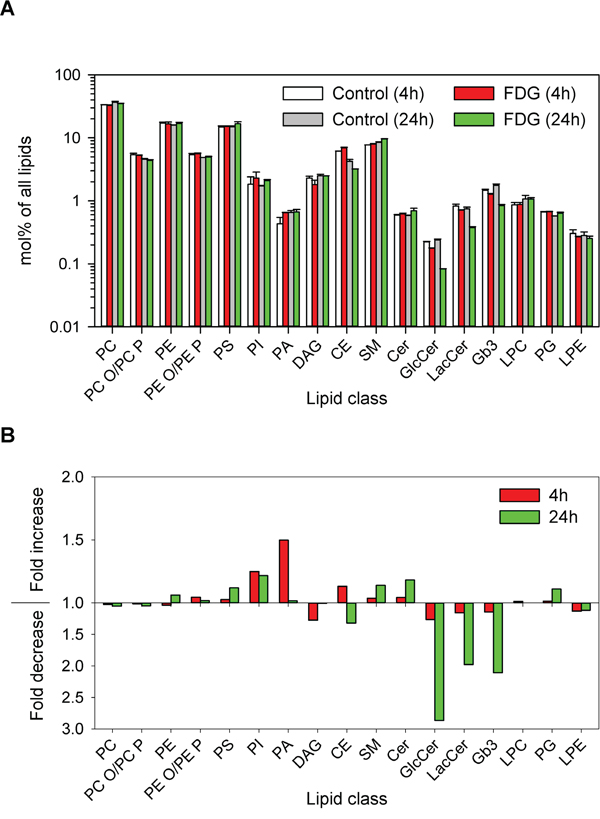 Figure 4: Changes in lipid composition after FDG treatment. Cells were treated with or without 1 mM FDG for 4 or 24 h, and whole-cell lysates were analysed by MS. A. The relative amount of different lipid classes in the samples; the error bars show the deviation from the mean of two biological samples. B. Relative fold change in lipid classes after 4 and 24 h treatment with FDG compared to control samples.