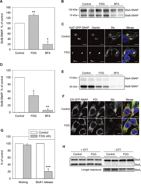 Figure 5: FDG inhibits Stx transport to the ER and the release of StxA1. A and B. HEp-2-GalT-GFP-SNAP cells were treated with 1 mM FDG for 4 h, or with 2 μg/ml BFA for 30 min prior to incubation with 125I-Stx1-mut-BG for 1 h in the presence of the drugs. Cells were lysed, and Stx-SNAP was immunoprecipitated and run on SDS-PAGE. (A) The quantification of StxBbound to SNAP-tag. A representative autoradiogram is shown in (B). C. HEp-2-GalT-GFP-SNAP cells were treated with FDG as in (A) and (B) prior to incubation with Stx1-mut-BG-Alexa555. The cells were fixed, permeabilized and immunolabeled for giantin, prior to mounting with Prolong®Gold with DAPI, and imaged. The overlay image shows GalT-GFP-SNAP signal in green, giantin in red, Stx in grey and DAPI in blue. Scale bar, 10 μm. D and E. HEp2-ER-GFP-SNAP cells were treated as in (A) and (B) prior to incubation with 125I-Stx1-mut-BG for 5 h. Cells were lysed and Stx-SNAP was immunoprecipitated and run on SDS-PAGE. (D) The quantification of StxB bound to SNAP-tag. A representative autoradiogram is shown in (E). F. HEp-2-ER-GFP-SNAP cells were treated with FDG as in (A) and (B), and incubated with Stx1-mut-BG-Alexa555 for 1 h, followed by 4 h incubation with fresh medium. Cells were fixed, permeabilized and immunolabeled for PDI, prior to mounting with Prolong®Gold with DAPI, and imaged. The overlay image shows ER-GFP-SNAP signal in green, PDI in red, Stx in grey and DAPI in blue. Scale bar, 10 μm. G and H. HEp-2 cells were treated with 1 mM FDG for 4 h prior to incubation with 125I-Stx1-mut for 5 h at 37°C. Cell lysates were separated by reducing (+DTT) or non-reducing (-DTT) SDS-PAGE to determine the nicking of StxA or StxA1 release, respectively. A representative autoradiogram is shown in (H). The amount of released or nicked StxA1 was calculated as a percentage of total Stx (the sum of StxA and StxA1). (A), (D) and (G) show mean +SEM from at least three independent experiments; *p<0.05, **p<0.01, *** p<0.001, one sample Student’s t-test.