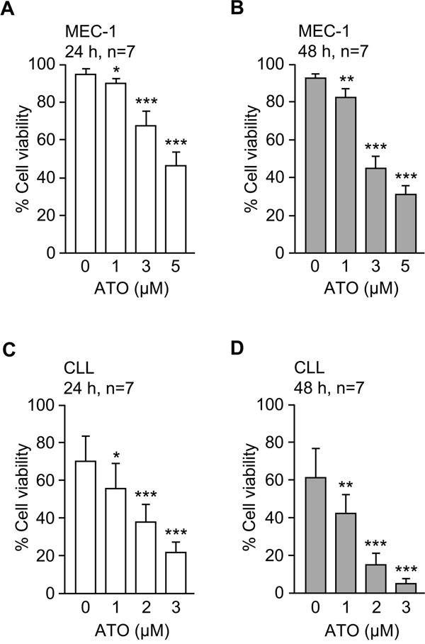 Figure 1: ATO efficiently induces apoptosis of MEC-1 and primary CLL cells. 1.5 x 105 MEC-1 cells in IMDM/0.1%FBS A, B. or 2 x 105 CLL cells in RPMI/0.1%FBS C, D. were cultured with or without the indicated concentrations of ATO for 24 h (A, C) or 48 h (B, D). Cell viability was determined by flow cytometry, using FITC-Annexin V and PI. *P ≤ 0.05; **P ≤ 0.01; ***P ≤ 0.001.