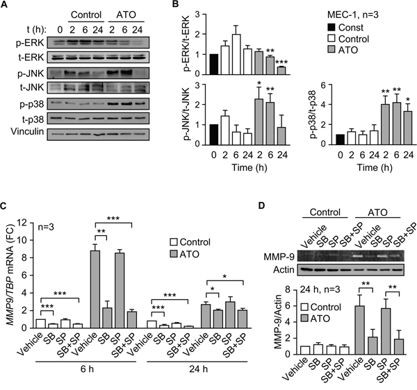 Figure 4: ATO upregulates MMP-9 in CLL cells via p38 MAPK activation. A, B. 3-5 x 106 MEC-1 cells in IMDM/0.1% FBS were incubated with or without 5 μM ATO for the indicated times and cell lysates analyzed by Western blotting. A representative experiment (A) and the quantitation of the three experiments performed (B), are shown. C. 3-5 x 106 MEC-1 cells in IMDM/0.1% FBS were incubated with or without SB203580 (SB, 10 μM), SP600125 (SP, 5 μM) or both. After 1 h at 37°C, 5 μM ATO was added or not and cells further incubated for 6 and 24 h. Total RNA was extracted and MMP9 mRNA levels analyzed by qPCR using TBP as internal control. Normalized average values are shown. FC, fold change. D. The conditioned medium of the same cells used in (C) was collected after 24 h and analyzed by gelatin zymography. The results from one representative experiment and the quantitation of the three experiments performed, after normalizing control values to 1, are shown. *P ≤ 0.05; **P ≤ 0.01; ***P ≤ 0.001, compared to their corresponding controls at each time point.