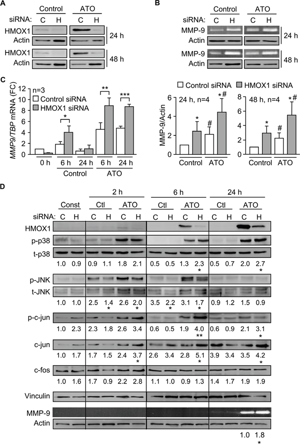 Figure 7: Gene silencing HMOX1 increases p38 MAPK/AP-1 activation and MMP-9 expression. A. 15 x 106 MEC-1 cells were nucleofected with HMOX1 (H) or control (C) siRNAs and incubated with or without 5 μM ATO for 24 h or 48 h. HMOX1 expression was analyzed by Western blotting. B. The conditioned media of the cells shown in (A) was concentrated and analyzed by gelatin zymography. A representative analysis, as well as the quantitation of the four experiments performed is shown. C. MEC-1 cells were nucleofected as in (A) and MMP9 mRNA expression analyzed by qPCR after 6 and 24 h of ATO treatment. Normalized average values are shown. D. 15 x 106 MEC-1 cells were nucleofected with HMOX1 (H) or control (C) siRNAs and treated with or without 5 μM ATO. At the indicated times, cells were lysed and analyzed by Western blotting. A representative experiment is shown. Numbers indicate the average values of three different experiments. Phosphorylated kinases were normalized with respect to their corresponding total protein; p-c-jun, c-jun, and c-fos were normalized with respect to vinculin. The conditioned media of these cells was analyzed by gelatin zymography, using actin as a loading control. *, #P ≤ 0.05; **, ##P ≤ 0.01; ***, ###P ≤ 0.001. *, control siRNA vs HMOX1 siRNA; #, control vs ATO.