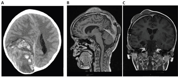 Figure 1: Imaging of CNS HGNET-BCOR primary tumor and metastasis. A. cCT scan of the primary tumor reveals a 92 x 61 x 87 mm large tumor in the right parieto-occipital lobe. B-C. cMRI shows three inoculation metastases on the skullcap.