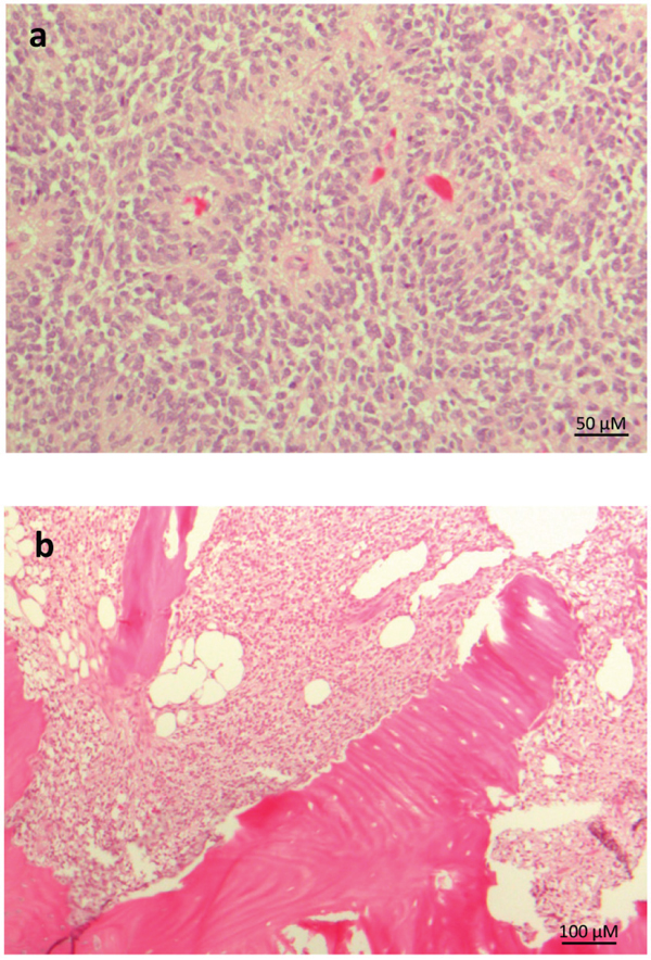 Figure 2: Representative histopathology of CNS HGNT-BCOR. HE staining of the primary tumor a. and a metastasis b. Pseudorosettes are lost in the metastasis.