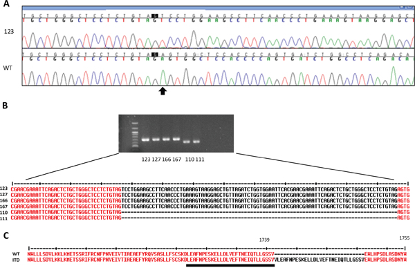 Figure 3: Detection of somatic ITDs in BCOR. A. The sequence of exon 15 of BCOR was analyzed by Sanger sequencing in the genomic DNA from blood (WT) or from the primary tumor (123). The arrow indicates the start of the ITD. B. RT-PCR showing an aberrant BCOR product in 2 regions of the primary tumor (123,127) and two metastases (166, 167) compared to normal brain (110 and 111). The ITD was confirmed by Sanger sequencing. C. Protein sequence of the ITD and of normal BCOR (WT). The WT region duplicated in the ITD is underlined. The amminoacid positions according to the sequence Q6W2J9-1 (UniProtKb) are indicated.