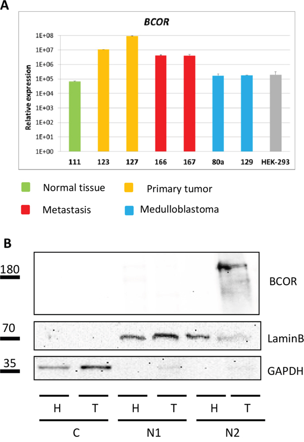 Figure 4: BCOR is overexpressed in CNS HGNET-BCOR. A. BCOR expression was analyzed by qRT-PCR in 2 regions of the primary tumor (123,127, in yellow), two metastases (166, 167, in red), normal parietal brain (111, in green), two medulloblastoma (80A, 129, in blue) and HEK-293 cells (grey). After normalization to the housekeeping gene HPRT1, the relative quantification value was expressed as 2−ΔΔCt. Expression analysis was done in triplicates. Standard deviation is indicated. B. Nuclear fractions containing soluble proteins (N1) or insoluble proteins (N2) and cytoplasm (C) isolated from the HEK-293 cell line (H) and the primary tumor (T, no 127) were analyzed by western blot with a BCOR specific antibody or antibodies against different cellular compartments (Lamin B for nuclei, GAPDH for cytoplasm).