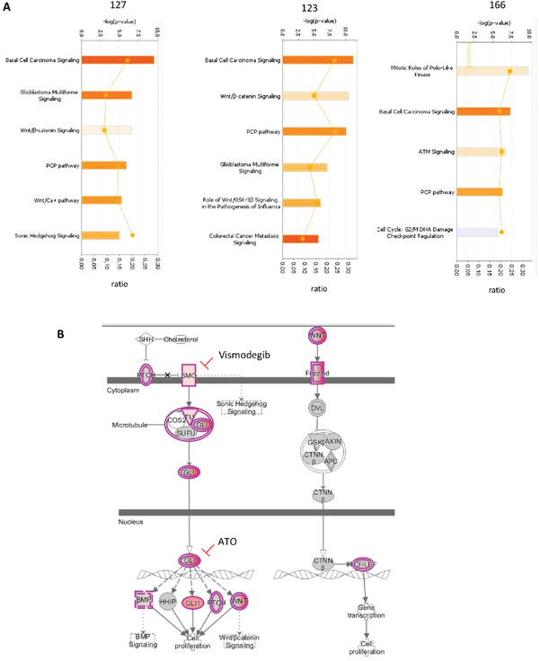 Figure 5: Pathways upregulated in CNS HGNET-BCOR. A. IPA analysis was performed for two regions of the primary tumor (123 and 127) and of one metastasis (166). The significant Canonical Pathways are displayed along the y-axis. The x-axis displays the -log of p-value which is calculated by Fisher's exact test right-tailed. Only pathways with a-log of p-value of 4.9 are shown. Orange bars predict an overall increase in the activity of the pathway while blue bars indicate a prediction of an overall decrease in activity (z-score). Only absolute z-score more than 0 are shown. The orange points connected by a thin line represent the ratio calculated as follows:# of genes in a given pathway that meet the cutoff criteria, divided by the total # of genes that make up that pathway and that are in the reference gene set. B. Representation of the BCC pathway according to IPA. Transcripts upregulated in the primary tumor are in violet. Clinical relevant inhibitors are indicated. The binding of SHH ligand to PTCH1 receptor relieves SMO inhibition and allows the release of the GLI family of transcription factors from a protein complex composed of SUFU, COS2 and FU. GLI proteins accumulate in the nucleus and control the transcription of the SHH target genes BMP, HHIP, GLI1, PTCH and WNT proteins. WNT proteins bind to the Frizzled receptor family and a signal is transduced to the cytoplasmic phosphoprotein DVL. Regulation of beta-catenin (CTNNβ) stability is mediated via a complex of proteins including AXIN, GSK3 and APC. In the nucleus beta-catenin binds and activates members of the T-cell factor (TCF)/lymphoid enhancer binding factor 1 (LEF) transcription factor family inducing the expression of target genes involved in the regulation of proliferation. Abbreviations: SHH = Sonic Hedghog protein, PTCH = patched, GLI = glioma-associated oncogene family zinc finger 1, SMO = Smoothened, SUFU = Suppressor of fused homolog, ATO= arsenic trioxide, COS2 = kinesin-like protein Costal-2, BMP = Bone morphogenetic proteins, HHIP = hedgehog-interacting protein, WNT = Wingless-type MMTV integration site family member, DVL= dishevelled segment polarity protein 1, CTNNβ = beta-catenin, AXIN = axis inhibition protein, APC = Adenomatous polyposis coli, FU= serine/threonine kinase 36, GSK3= glycogen synthase kinase 3.