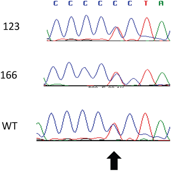 Figure 7: Detection of a PTCH1 polymorphism. The sequence of exon 23 of PTCH1 was analyzed by Sanger sequencing in the genomic DNA from blood (WT), primary tumor (123) and metastasis (166). The arrow indicates the rs357564.