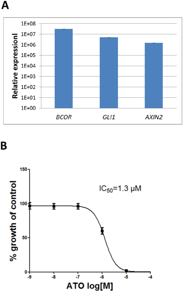 Figure 8: ATO reduces the viability of a short-term CNS HGNET-BCOR cell culture. A. Expression of BCOR, GLI1 and AXIN2 in the PhKh1 cell culture at passage 4 was analyzed by qRT-PCR. After normalization to the housekeeping gene HPRT1, the relative quantification value was expressed as 2−ΔΔCt. B. PhKh1 cells were treated with ATO at doses from 1 nM to 100 μM. The logarithm of the Molarity (log [M]) is displayed on the X axis. The % of viable cells compared to the control treated with vehicle alone is shown on the Y axis. The data were fit to a sigmoidal dose-response curve using the GraphPad software. A representative experiment of three independent experiments is shown.