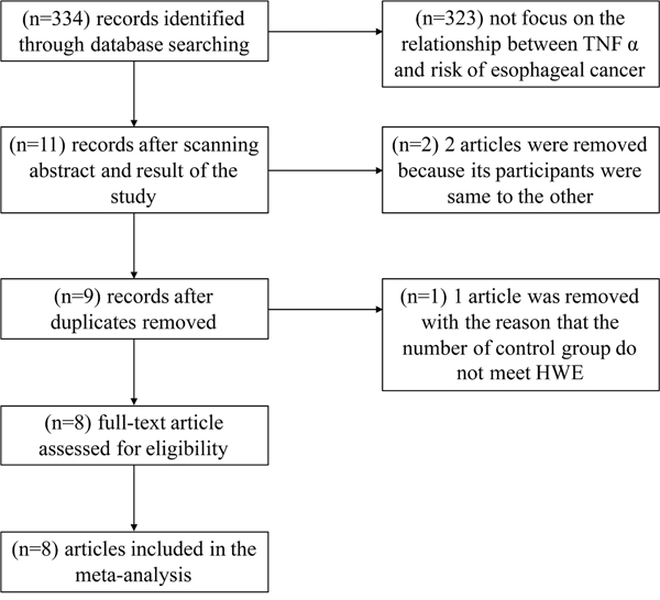 Figure 1: A flow diagram for the study selection process. In all, 334 articles were identified using the search strategy. Of these, 323 articles were excluded because they do not investigate the association between rs1800629 and risk of esophageal cancer and 11 articles were screened further. Of the 11 articles,1 article was excluded because the genotype of the case-control group did not satisfy the Hardy-Weinberg Equilibrium (HWE), and 2 articles were excluded with the reason that their participants were same to the other. Finally, 8 publications with 11 case-control studies were included in the meta-analysis.
