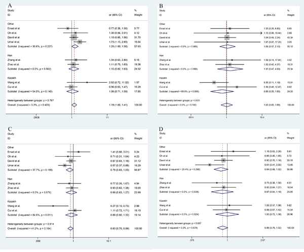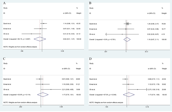 Figure 5: The funnel plot of different model and allele frequency (ESCC group). A. dominant model; B. recessive model; C. over-dominant model; D. allele frequency.
