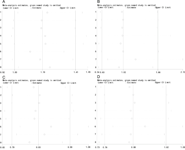 The stability of the study was detected by “metaninf” module in STATA version 14.0 (STATA Corporation, College Station, TX, USA). The sensitivity analysis indicates that the results was stable. Because of the limited number of studies in EAC group, the analysis was only performed in ESCC group. In ESCC group, the results of sensitivity analysis are shown in Figure 4.