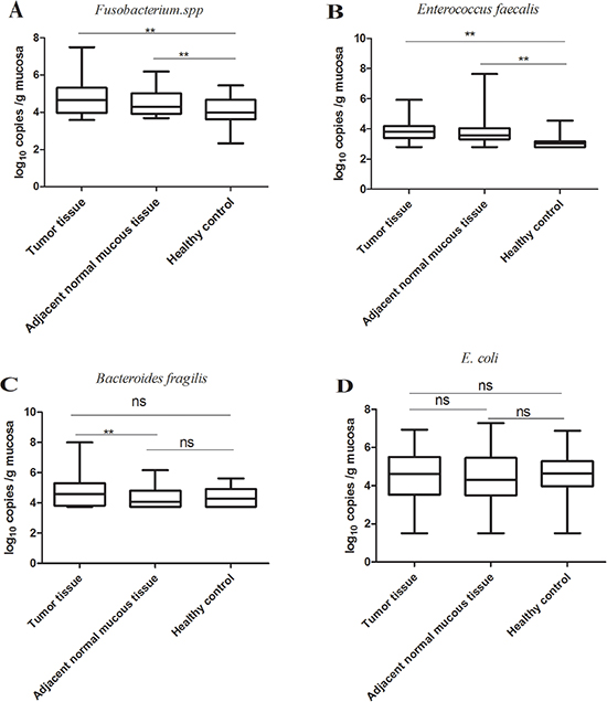 Figure 2: Quantification of bacteria in tumor tissues, adjacent normal mucous tissues of CRC patients and control tissues from age- and gender-matched healthy volunteers. Fusobacterium spp. (NCRC = 97, NHC = 48; p < 0.05, Kruskal-Wallis test followed by multiple comparisons) and E.faecalis (NCRC =97, NHC =48; p < 0.05, Kruskal-Wallis test followed by multiple comparisons) were markedly enriched in the matched adjacent normal mucous tissues compared to the healthy controls. No difference in E.coli (NCRC = 96, NHC = 48; p > 0.05) and Bacteroides fragilis (NCRC =87, NHC =48; p > 0.05) was observed between tumor tissues, corresponding adjacent normal mucous tissues and healthy controls. **p < 0.05; ns, no significance. NCRC, the number of CRC patients; NHC, the number of healthy controls.