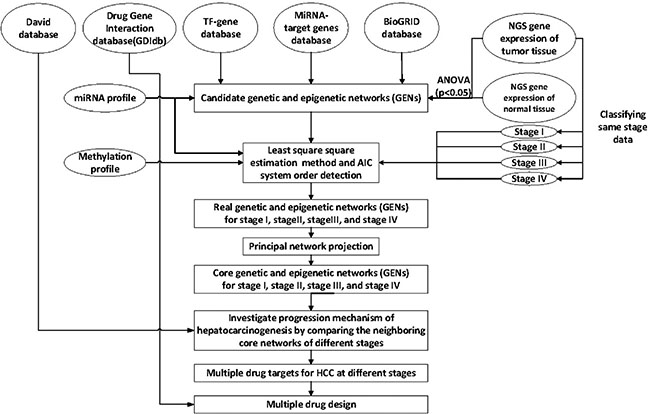 Figure 1: Overview of the construction of genetic and epigenetic networks (GENs) and core GEN to analyze the mechanism of hepatocarcinogenesis progression and multiple-drug design, via big database mining and system identification. NGS profiles of HCC and normal tissue samples, miRNA and DNA methylation data, and the miRNA, TF-gene, and BioGRID databases were searched to construct candidate GENs, including candidate GRN, PPIN, and miRNA-gene regulatory networks. The false positive candidate GENs were pruned by system modeling and least square estimation, wherein the insignificant components were deleted from the system order based on AIC. The core GENs for each stage were obtained by extracting the principal structure of GENs through PNP. By mapping the core GENs to pathways retrieved using DAVID, and by comparing core GENs among the different stages, we investigated the mechanism of HCC progression. We also proposed potential therapeutic drugs against genes encoding significant epigenetic changes, in order to arrest the progression of HCC, by mining the DGIdb.