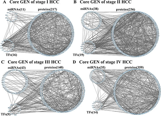 Figure 2: Core GENs of stage I (A), stage II (B), stage III (C), and stage IV (D) HCCs extracted by PNP method.