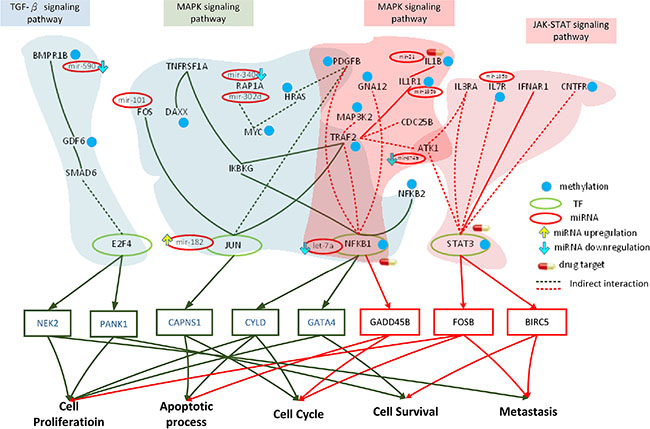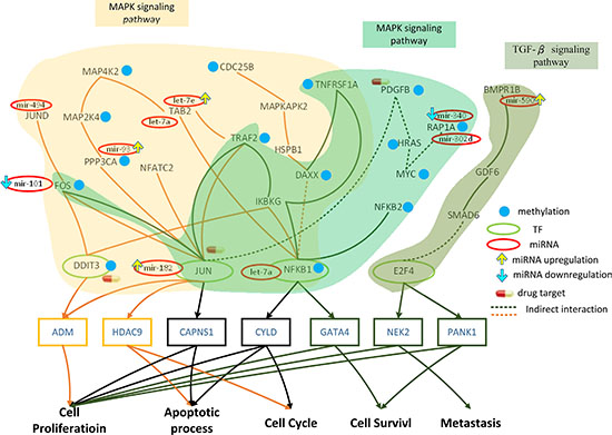 We further identified the TFs in various signaling pathways, encoded by target regions in core genes (Figure 4), as follows: JUN and NFKB1 in the MAPK pathway, and E2F4 in the TGF-β. This allowed us to analyze the effect of miRNA and DNA methylation on the MAPK and TGF-β pathways; we determined that dysfunctions in these processed might cause an aberration in the function of downstream target genes.