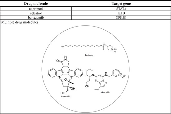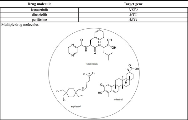 Multiple drug molecules to prevent the progression of HCC from stage I to stage II based on the target genes of dysregulated miRNA and genes with methylation changes, as shown in Figure 3; moreover, the selected drug molecules should induce minimal side effects on other genes highlighted in Figure 3. The strategy to identify multiple drug molecules to prevent the progression of HCC from stage I to stage II is that we used the Drug-Gene Interaction database (DGIdb) to search drugs, which specifically interact one gene in Figure 3. According to the DGIdb [35] , lestaurtinib, dinaciclib, and perifosine specifically interact with NTRK2, MYC, and AKT1, respectively, and have a minimal side effect on the other genes. Additionally, the proposed drug molecules have proven anti-cancer effects [36–38]. Therefore, we designed a drug, comprising lestaurtinib, dinaciclib, and perifosine, to prevent the progression of HCC from stage I to stage II (Table 5).