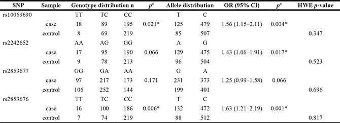 Table 4: The haplotypes of two SNPs (rs10069690 and rs2242652) and risk of Gastric cancer (adjusted by age and gender)