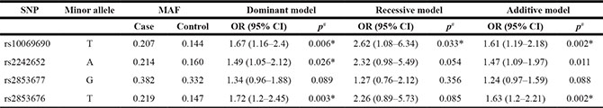 Logistic regression analyses revealed that SNPs rs10069690 and rs2853676 were associated with GC risk by both a dominant model (rs10069690, [OR] = 1.67; 95% [CI] = 1.16−2.4; p = 0.006 and rs2853676, [OR] = 1.72; 95% [CI] = 1.2−2.45; p = 0.003) and an additive model (rs10069690, [OR] = 1.61; 95% [CI] = 1.19−2.18; p = 0.002 and rs2853676, [OR] = 1.63; 95% [CI] = 1.2−2.21; p = 0.002; Table 3). All analyses were adjusted by age and gender, and associations with risk of GC remained significant.