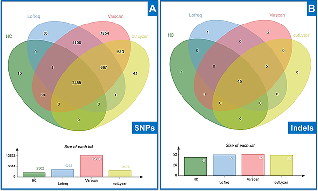 Figure 1: Venn diagram of mutations found by each variant-caller tested. In both figures, HC = HaplotypeCaller (A) Comparison of SNVs identified (B) Comparison of Indels identified.