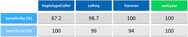 Dedicated bioinformatics tools can help to ensure good sensitivity and specificity. Detection of mutations is a key step in bioinformatics analysis and is performed by variant-calling software. An example of the numerous variant-callers currently available is HaplotypeCaller in the GATK suite [9]. It is a reference in genotyping germline genomes but its sensitivity can dramatically decrease when faced with low level mutations. Others like Varscan2 [10] and LofreqStar [11] have been designed especially for tumor sample analysis and the detection of low level mutations but are efficient mainly for comparing matched healthy and tumor samples. In many diagnostic laboratories a matched healthy sample is not available for analysis owing to ethical considerations, organizational difficulties or legal constraints. Furthermore, even if it were to be available, sequencing would be twice as expansive owing to the need to sequence two different samples for the same patient.