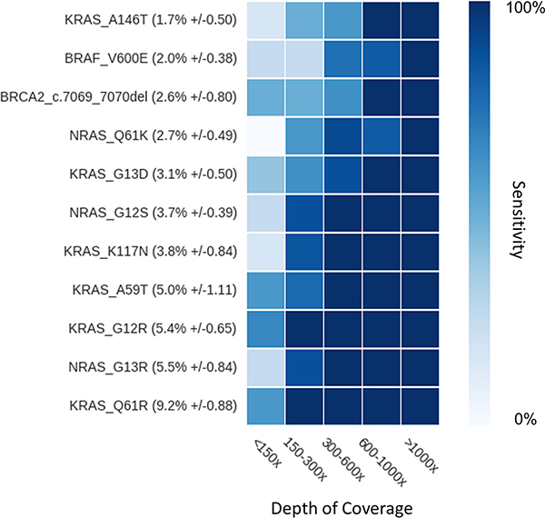 Figure 4: Impact of coverage on sensitivity. Each mutation of interest (y-axis) is ranked according to its average allele-ratio in ascending order from top to bottom. Sensitivity is calculated for each mutation at each coverage category (x-axis), and represented by color variations from 0 to 100% as shown on color bar on the right.