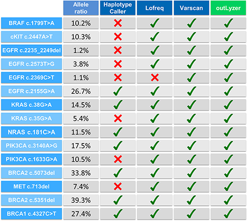 Figure 6: Performance of all variant-callers on HorizonDX sample. Red cross means that mutation was not detected by the corresponding software.