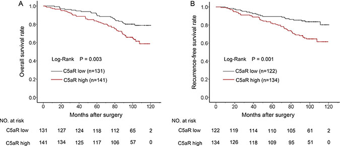 Figure 1: Kaplan-Meier analyses for prognosis of ccRCC patients according to tumoral C5aR level. (A) OS according to C5aR level and; (B) RFS according to C5aR level.