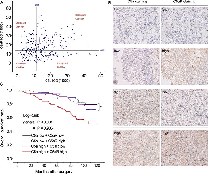 Tissue microarrays (TMA) were established as previously described [25]. Monoclonal anti-C5aR antibody (1:100 dilution, ab11867, Abcam, Cambridge, MA, USA) was applied in the procedure. Away from tissue margin or obvious inflammatory or necrotic domains, we randomly took three shots of tumor staining. The intensity was assessed by Image-Pro Plus 6.0 and integrated optical intensity (IOD) was recorded. Subsequent X tile plot analyses (X tile software 3.6.1) were performed to determine the optimum cutoff IOD score by the rule of “minimum P value”. The point was 14622 in this study for C5aR level division.