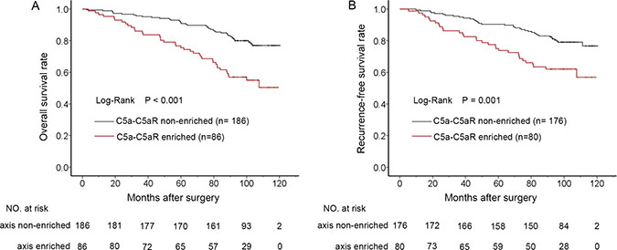 Figure 3: Kaplan-Meier analyses for prognosis of ccRCC patients according to C5a-C5aR status. (A) OS according to C5a-C5aR status and; (B) RFS according to C5a-C5aR status.