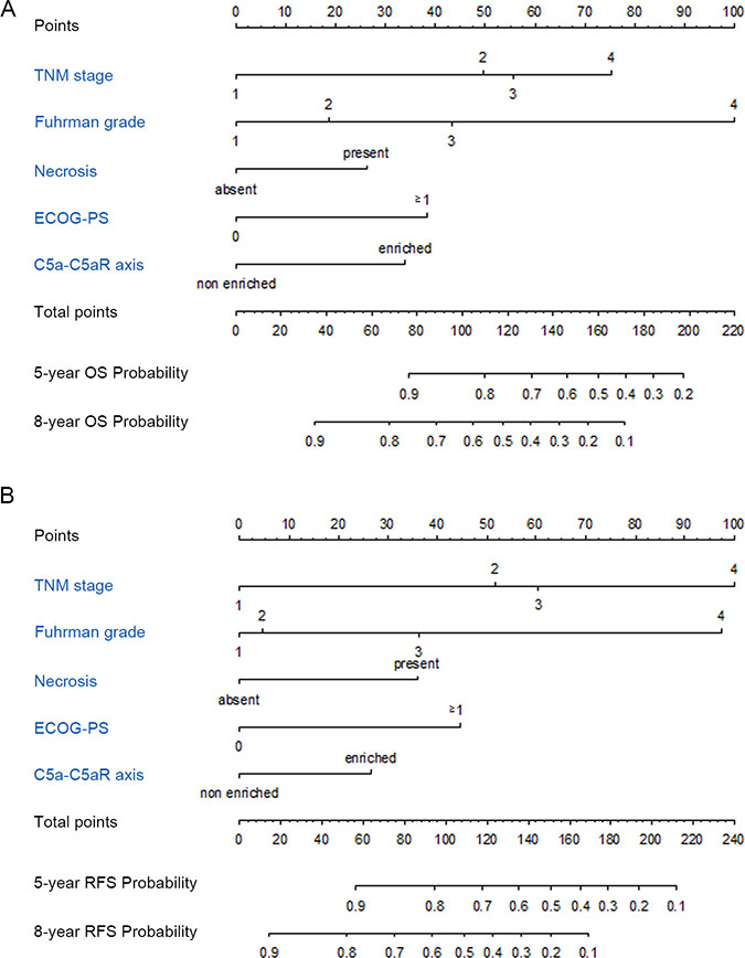 Figure 4: Nomogram for predicting 5- and 8-year prognosis of ccRCC patients. (A) Nomogram for OS prediction; (B) Nomogram for RFS prediction.
