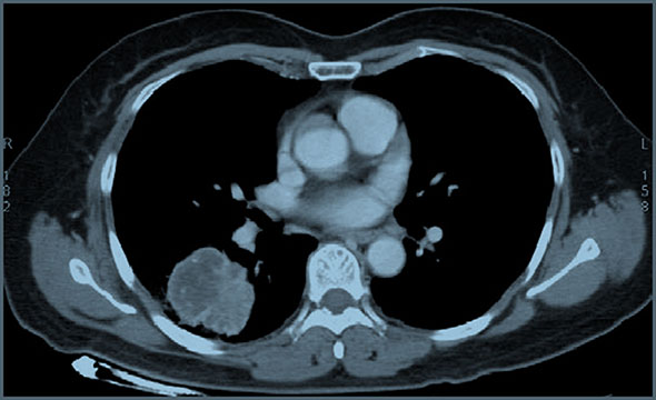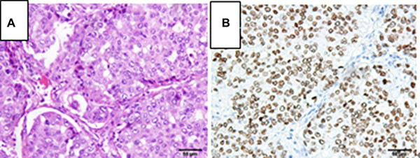 An abnormal chest x-ray shadow was detected in a 61-year-old woman in a regular check-up in August 2012. She was referred to our hospital due to a mass considered pulmonary carcinoma. The patient did not experienced any symptoms, such as cough, chest pain, fatigue, weight loss, but with carcinoembryonic antigen (CEA) 187.4 ng/ml. Bronchoscopy revealed chronic inflammation without carcinoma cell. She underwent preoperative chest and abdominal computed tomography, head magnetic resonance and bone imaging. It revealed a solitary mass measuring 4.8 cm in size without metastasis in other sites (Figure 1). In September, she underwent right lower lobectomy and mediastinal lymph node dissection. The histological diagnosis was poorly differentiated adenocarcinoma (pT2aN0M0, stage IB) (Figure 2A), with positive Thyroid Transcriptional Factor-1 (TTF-1) (Figure 2B) and Cytokeratin 7 (CK7). Mutational analysis revealed epidermal growth factor receptor (EGFR) wild type and anaplastic lymphoma kinase (ALK) negative. She was a non-smoker, but a Hepatitis B virus carrier for 21 years.