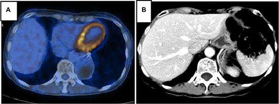 Figure 6: PET/CT (A) and CT with contrast (B) in follow-up care showing liver lesions disappeared after erlotinib therapy and achieved CR.