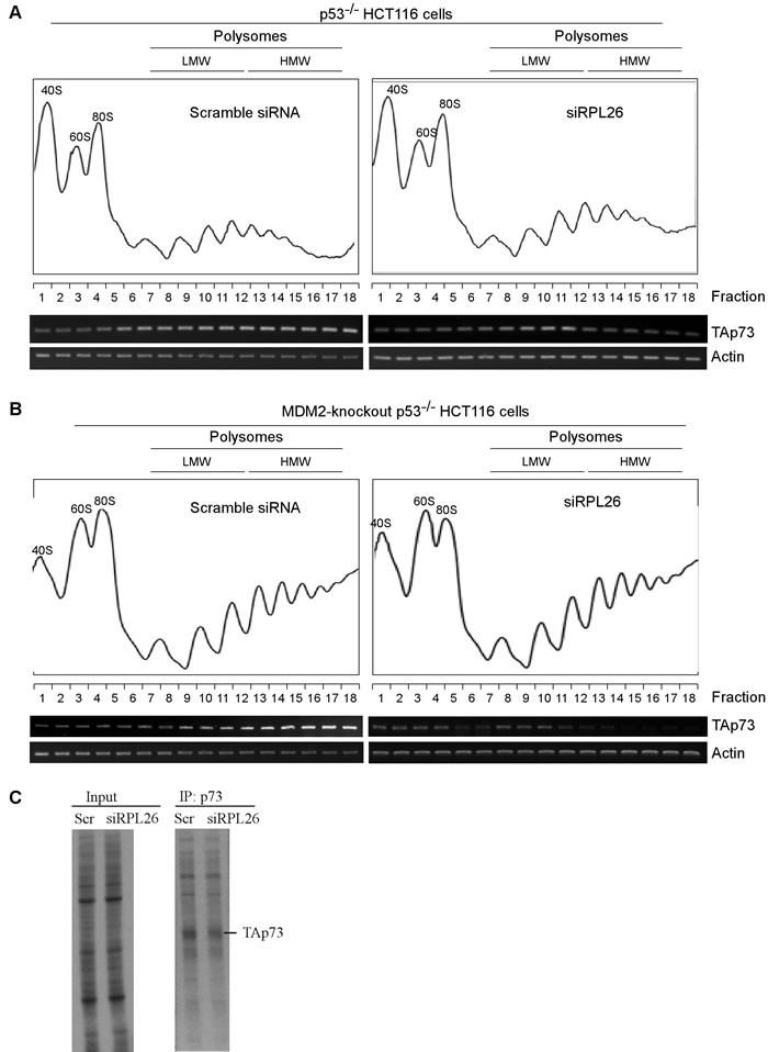 Figure 3: RPL26 is necessary for proper assembly of polysomes on TAp73 mRNA and mRNA translation. A. Sucrose density gradient was used to separate polysomes from p53-/- HCT116 cells transfected with scramble siRNA or siRNA against RPL26 for 72 h. The level of TAp73 and actin transcripts was measured in each fraction. B. The experiment was performed as in A. except that MDM2-knockout p53-/- HCT116 cells were used. C. MDM2-knockout p53-/- HCT116 cells were transfected with scrambled siRNA or siRNA targeting RPL26 (siRPL26) for 3 days and the level of newly synthesized TAp73 protein was measured by 35S-metabolic labeling.