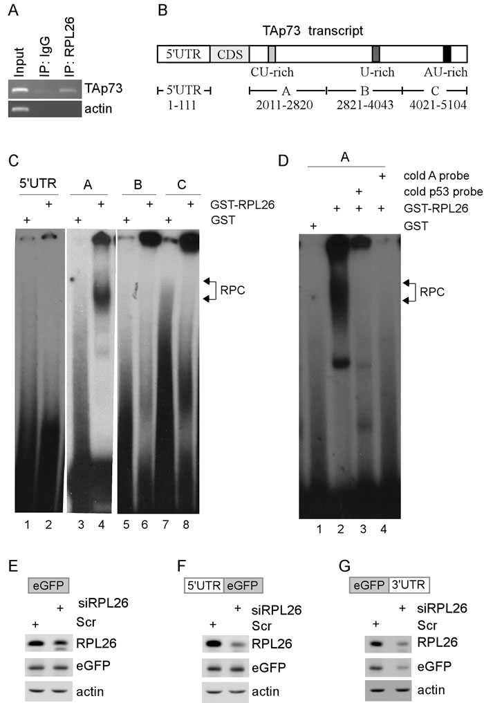Figure 4: p73 3’UTR is recognized by and responsive to RPL26. A. RPL26 interacts with TAp73 transcript. Cell extracts from RPL26-expressing p53-/- HCT116 cells were immunoprecipitated with a control IgG or anti-RPL26 antibody. The levels of transcripts for TAp73 and actin in IgG or anti-RPL26 immunocomplexes were determined by RT-PCR. B. Schematic presentation of TAp73 transcript and the location of probes used for REMSA. CDS represents p73 coding region. Fragments A-C cover the entire p73 3’UTR. C. Probes A is bound by RPL26. REMSA was performed by mixing 32P-labeled 5’UTR, fragment A, B, or C probe with recombinant GST or GST-RPL26 protein. The bracket indicates RNA-protein complexes (RPC). D. Competition assay was performed by adding an excess amount (50-fold) of a mix of cold p53 probes derived from p53 5’and 3’ UTRs, or unlabeled fragment A derived from p73 3’UTR to the reaction mix prior to incubation with the 32P-labeled probe A. E.-G. p73 3′ UTR is responsive to RPL26. H1299 cells were transfected with scramble siRNA (Scr) or RPL26 siRNA for 72 h, and then transfected with a vector that contains the eGFP coding region alone E., the eGFP coding region plus TAp73 5′ UTR F., or the eGFP coding region plus p73 3′ UTR G.. Whole cell lysates were collected and the levels of eGFP, RPL26, and actin were analyzed by western blot analysis.