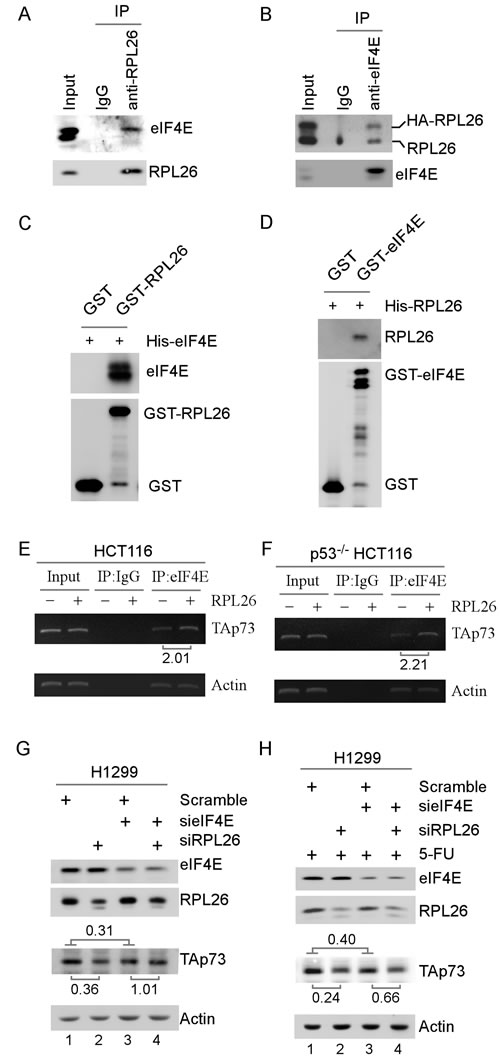 Figure 5: RPL26 modulates eIF4E to regulate p73 mRNA translation via physical interaction. A. Lysates purified from H1299 cells were treated with RNase A and then immunoprecipitated with IgG or anti-RPL26, followed by western blot analysis with antibodies against eIF4E and HA (for HA-RPL26), respectively. B. Cell extracts were purified from HA-RPL26-expressing H1299 cells, treated with RNase A, and then immunoprecipitated with IgG or anti-eIF4E, followed by western blot analysis with antibodies against RPL26 and eIF4E, respectively. C. GST pull-down assays were performed with GST or GST-tagged RPL26 incubated with an equal amount of His-tagged eIF4E along with glutathione sepharose for 1 h. Complexes were then washed, followed by western blot analysis using antibody against histidines (anti-omini) or GST. D. The experiment was performed as in C. except that His-tagged RPL26 and GST-tagged eIF4E were used. E. Cell extracts from HCT116 cells, which were transfected with pcDNA3 vector or a vector expressing HA-RPL26, were immunoprecipitated with IgG or anti-eIF4E antibody. Total RNAs were purified from immunocomplexes and subjected to RT-PCR analysis to measure the levels of TAp73 and actin transcripts. The relative level of TAp73 transcript was measured by densitometry and the relative fold change was shown below each pair. The data shown are representative of three independent experiments. F. The experiment was performed as in E. except that p53-/- HCT116 cells were used. G. The levels of eIF4E, RPL26, TAp73, and actin proteins were measured in H1299 cells transfected with siRNA against eIF4E along with scramble siRNA or siRNA against RPL26 as indicated for 72 h. The data shown are representative of three independent experiments. H. The experiment was performed as in G., except the cells were treated with 5-FU (100 µM) for 24 h.