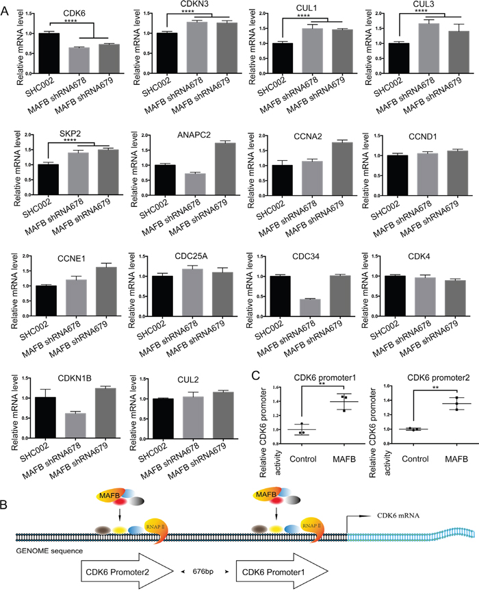 Figure 3: MAFB regulates expression of cell cycle factors. RNA was extracted from SW1116 cells transfected with scramble shRNA (SHC002), MAFB shRNA678 or MAFB shRNA679 and cell cycle factors controlling the G1/S phase transition were analyzed via RT-qPCR A. Schematic of the human CDK6 promoter regions B. Relative CDK6 promoter activity was analyzed by luciferase assay C. The pRL-SV40 vector and pGL4.15 luciferase reporter vector containing the CDK6 promoter region were co-transfected with an MAFB expression vector or mock vector into 293T cells. Data are presented as means ± SEM. **P<0.01.