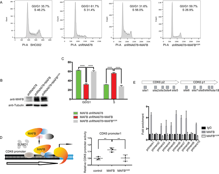 In this study, the key cell cycle factor CDK6 was shown to be a direct target of MAFB. A luciferase reporter assay was performed to assess the impact of MAFB SUMOylation on CDK6 transcription. Co-transfection of reporter construct with wild-type MAFB promoted CDK6 expression in HEK293T cells; however, the SUMO modification-deficient MAFBK32R lost transactivation activity (Figure 5D). This observation was supported by chromatin immunoprecipitation (ChIP) quantitative PCR results showing that MAFB, but not MAFBK32R, bound the CDK6 promoter region (Figure 5E).