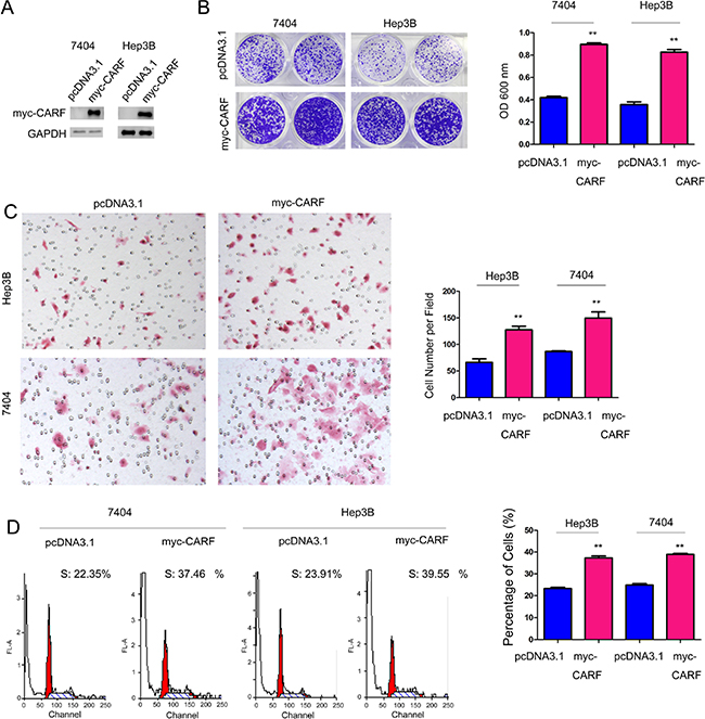 Figure 3: CARF promoted the growth and migration of HCC cells. (A) Forced expression of myc-tagged CARF in 7404 and Hep3B cells. (B) Over-expression of CARF promoted the growth of 7404 and Hep3B cells demonstrated by the crystal violet assay. The experiments were performed in triplicates. (C) Over-expression of CARF promoted the migration of 7404 and Hep3B cells demonstrated by the Boyden Chamber assay. The experiments were performed in triplicates. (D) Over-expression of CARF altered the distribution of the cell cycle and increased the percentage of cells in S phase. The percentage of cells in S phase was statistically analyzed. The experiments were performed in triplicates. **P < 0.01.