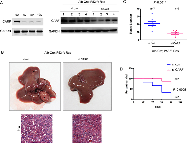 Figure 7: Knocking down the expression of CARF inhibited the tumorigenesis in the HCC mouse model (Alb-Cre; P53f/f; Loxp-Stop-Loxp-RasG12D). (A) Adeno-associated virus-mediated knocking down the expression of CARF in the liver of HCC mouse model six weeks after adenovirus injection. In the left, the knocking down efficiency was examined at the indicated point. (B) The morphology of the tumors six weeks after adenovirus injection. The HE staining of the liver was shown below. The asterisk indicated the tumor region. (C) Knocking down the expression of CARF inhibited the tumorigenesis in the HCC mouse model demonstrated by the tumor number. (D) Knocking down the expression of CARF improved the survival of HCC mouse model.