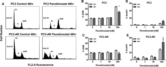 Figure 2: PC3 and PC3-AR cells were treated with increasing concentrations of panobinostat for 24 and 48 hours. Cells were trypsinized and washed in 1x PBS before being fixed in 70% ethanol and stained with PI. Cell cycle distribution was assessed by flow cytometry. (A) Representative histograms of cell cycle profile of PC3 and PC3-AR cells treated with 100nM panobinostat for 48 hours. (B-C) Quantitated measurements of G2M cell cycle distribution and (D-E) subG1 cell cycle distribution for PC3 and PC3-AR cells following panobinostat treatment. Columns represent mean of 3 independent experiments ±SE.* p < 0.05 (two-tailed t-test).