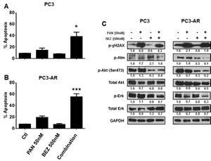Figure 4: (A-B) PC3 cells and PC3-AR cells were treated with indicated concentrations of panobinostat and/or BEZ235 for 48 hours. Cells were trypsinized and washed in 1x PBS and stained with annexin V dye. Annexin V positive cells were assessed by flow cytometry. Columns represent mean of three independent experiments ±SE. * indicates p = 0.01 for combination treatment compared to single treatments by one-way ANOVA. *** indicates p = 0.0002 for combination treatment compared to single treatments by one-way ANOVA. (C) PC3 and PC3-AR cells were treated with indicated concentrations of panobinostat and/or BEZ235 for 24 hours. Following treatment, total cell lysates were prepared and immunoblot analysis was performed for p-ɣH2AX (ser139), p-Atm (Ser1981), p-Akt (Ser473), Akt, p-Erk1/2 and Erk1/2. The expression of GAPDH in lysates served as the loading control. The numbers below the bands represent densitometry performed by image j analysis on representative immunoblots relative to the control cells.