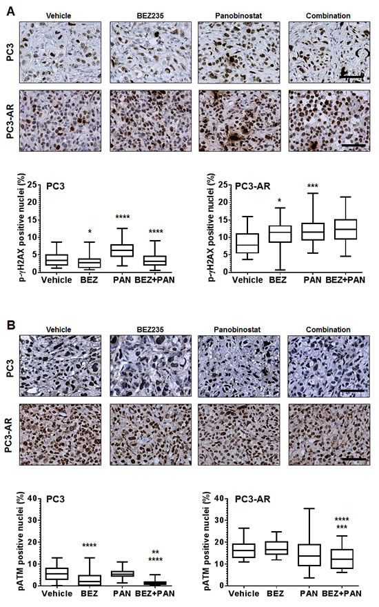 Combination with BEZ235 and PAN results in increased DNA damage and reduced ATM expression in PC3 and PC3-AR tumors. To assess the activity of BEZ235 and/or PAN on induction of DNA damage and inhibition of ATM expression in vivo, we used immunostaining to determine the expression of p-ɣH2AX and ATM. Fig. 6A shows that treatment of PC3 and PC3-AR tumors with BEZ235 resulted in tumor specific effects, where p-ɣH2AX levels were reduced in PC3 tumors (p=0.01) but increased in PC3-AR (p=0.01) tumors compared to vehicle treated tumors. As expected, PAN significantly increased p-ɣH2AX levels in both tumors (PC3, p<0.0001; PC3-AR, p=0.0003) compared to mice treated with vehicle. Combination treatment also resulted in tumor specific effects, as p-ɣH2AX was reduced to levels similar to vehicle treatment, though in PC3-AR tumors, p-ɣH2AX levels increased comparable to PAN single treated tumors.