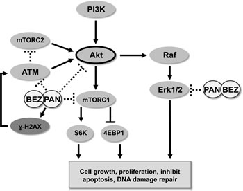 BEZ235 (Novartis) is an orally available PI3K/mTOR inhibitor [27] that demonstrated efficacy in inhibiting tumor growth in preclinical mouse models [28-35]. Treatment with BEZ235 of multiple tumor types has resulted in potent inhibition of Akt, mTORC1 and mTORC2 activity. However, it has been recently demonstrated that BEZ235 inhibits the DDR proteins DNA-PK and ATM [36], both which share high homology of their catalytic domain with PI3K [37].