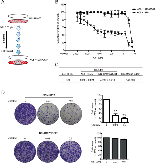 Figure 1: Establishment of NCI-H1975 cells resistant to OSI. A. Schematic of establishing OSI-resistant NCI-H1975 cells. B. Cells were incubated with various concentrations of OSI for 72 h. The anti-proliferative effects of OSI in NCI-H1975 and NCI-H1975/OSIR cells were evaluated by MTT assay. *P<0.05 and **P<0.01, compared with the 0 μM OSI treatment. C. The IC50 values of OSI in NCI-H1975 and NCI-H1975/OSIR cells. D. Cells were exposed to OSI for 72 h and incubated with drug-free medium for 7 days. Then, cells were fixed with 4% PFA and stained with crystal violet. The cell colonies were photographed and representative images were exhibited. For quantitative assay, clones were dissolved in acetate acid after crystal violet staining and absorbance was recorded. *P<0.05 and **P<0.01.