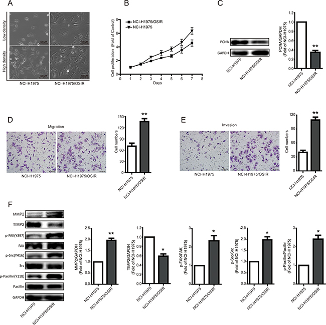 Figure 2: Characterization of the proliferation, migration, and invasion abilities of NCI-H1975 and NCI-H1975/OSIR cells. A. After cells adhered to 6-well plate for 24h, the cell morphology was imaged and typical photos were presented. B. After NCI-H1975 and NCI-H1975/OSIR cells were plated in 96-well plate at same concentration, the cell proliferation was detected by MTT assay as indicated days. C. The protein expression of PCNA was determined by western blot assay. *P<0.05 and **P<0.01. D, E. the migration and invasion of NCI-H1975 and NCI-H1975/OSIR cells were determined by transwell assay. The migration and invasion ability of cells was determined by counting cell numbers that migrated or invaded the underside of the porous polycarbonate membrane by crystal violet staining. Typical images were photographed and presented. The quantification result was obtained from three independent experiments. *P<0.05 and **P<0.01. F. The expressions of indicated proteins were determined by western blot assay. *P<0.05 and **P<0.01.