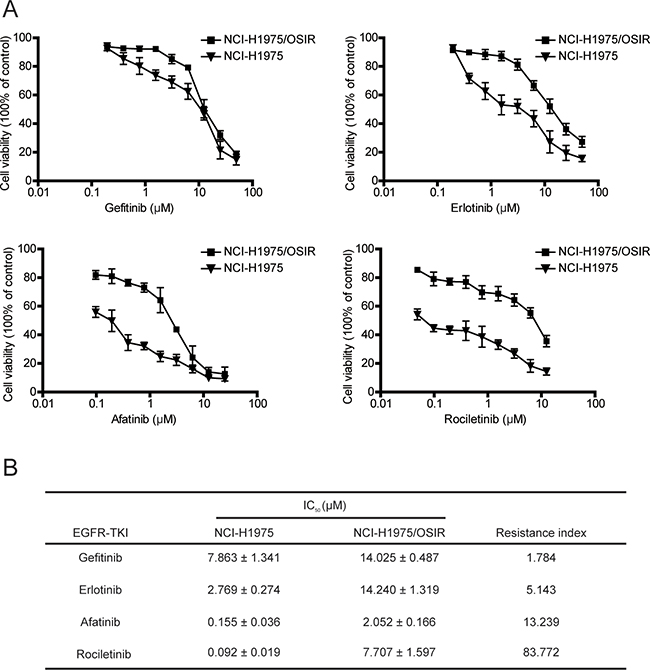 Figure 3: Characterization of the sensitivity of NCI-H1975 and NCI-H1975/OSIR cells to EGFR TKIs. A. NCI-H1975 and NCI-H1975/OSIR cells were treated with indicated concentrations of EGFR TKIs for 72 h. Cell viability was studied using MTT assay. B. The IC50 values of EGFR TKIs in NCI-H1975 and NCI-H1975/OSIR cells.