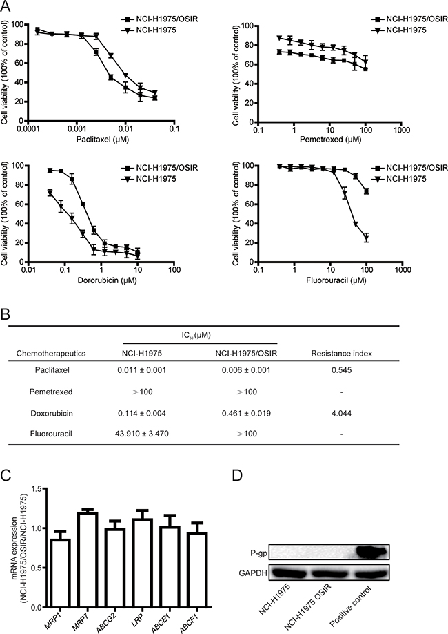 Figure 4: Characterization of the sensitivity of NCI-H1975 and NCI-H1975/OSIR cells to chemotherapeutics. A. After cells were exposed to various concentrations of chemotherapeutics for 72 h, the cell viability was detected by MTT assay. B. The IC50 values of chemotherapeutics in NCI-H1975 and NCI-H1975/OSIR cells. “-” means “cannot statistics”. C. The mRNA levels of indicated genes in NCI-H1975 cells and NCI-H1975/OSIR cells were determined by RT-PCR. D. The cell proteins were extracted and the expressions of P-gp and GAPDH were studied by western blot.