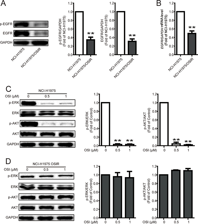 Figure 5: Characterization of EGFR and the downstream proteins in NCI-H1975 and NCI-H1975/OSIR cells. A. After cells were plated for 24 h, the cell proteins were extracted and the expressions of p-EGFR, EGFR, and GAPDH were studied by western blot. *P<0.05 and **P<0.01. B. The mRNA levels of EGFR in NCI-H1975 and NCI-H1975/OSIR cells were determined by RT-PCR. *P<0.05 and **P<0.01. C-D. NCI-H1975 and NCI-H1975/OSIR cells were cultured with indicated concentrations of OSI for 24 h. Cell extracts were analyzed for indicated protein expression using western blot analysis. The blots of Figure 5C and 5D were obtained under the same exposure time. *P<0.05 and **P<0.01.