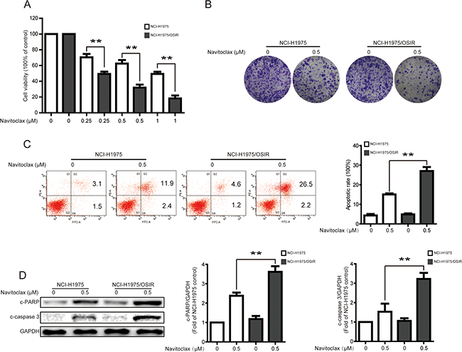The decreased expression of EGFR in cells have been reported to be sensitivity to the BH3 mimetic navitoclax [11]. Therefore, the cell viabilities of NCI-H1975 and NCI-H1975/OSIR cells following navitoclax treatment were studied. As shown in Figure 6A, cells were treated with various concentrations of navitoclax for 48 h. The cell viability for the NCI-H1975/OSIR cells were significantly lower than that for the NCI-H1975 cell line, with cell viabilities remaining at 70.48%, 62.57%, and 49.35% for NCI-H1975 cells and 49.35%, 31.94%, and 18.27% for NCI-H1975/OSIR cells after treatment with 0.25, 0.5, and 1 μM navitoclax, respectively. This difference in cell viability inhibition of navitoclax in NCI-H1975 and NCI-H1975/OSIR cells were further confirmed by colony formation analysis. Fewer colonies were observed in NCI-H1975/OSIR cells after treatment with navitoclax, when compared with NCI-H1975 cells (Figure 6B). In order to investigate the potential mechanisms for the aforementioned phenomenon, the pro-apoptotic effect of navitoclax in the two cell lines was studied. Annexin V-FITC and propidium iodide (PI) dual labeling assay demonstrated that a higher percentage of apoptotic cell was induced by navitoclax treatment in NCI-H1975/OSIR cells than in NCI-H1975 cells (Figure 6C). In addition, the protein expressions of c-PARP and c-caspase 3, which are biomarkers of apoptosis, were studied via western blot. As shown in Figure 6D, the navitoclax-induced expressions of c-PARP and c-caspase 3 proteins were more remarkable in NCI-H1975/OSIR cells, compared with NCI-H1975 cells. These data indicated that NCI-H1975/OSIR cells were more sensitive to navitoclax, compared with NCI-H1975 cells.