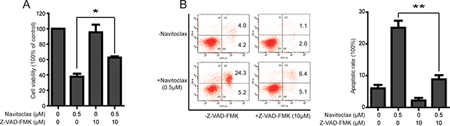 Figure 7: Navitoclax-induced cell viability inhibition and apoptosis can be reversed by pretreatment of Z-VAD-FMK in NCI-H1975/OSIR cells. A. NCI-H975/OSIR cells were treated with navitoclax for 48 h with or without pretreatment of Z-VAD-FMK (10 μM, 1 h). Cell viability was then evaluated using MTT assay. *P<0.05 and **P<0.01. B. After pretreatment with 10 μM Z-VAD-FMK for 1 h, NCI-H1975/OSIR cells were incubated with 0.5 μM navitoclax for 48 h, the apoptotic cells were stained with annexin V/PI and determined by a flow cytometry according to the manufacturer’s instructions. *P<0.05 and **P<0.01.